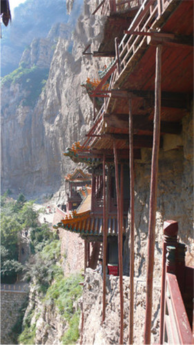 ·全寺为木质框架式结构,有殿琮楼阁40 间,其实悬空寺不大,最值得惊叹的是它依靠榫接结构,嵌入崖内而不倒。