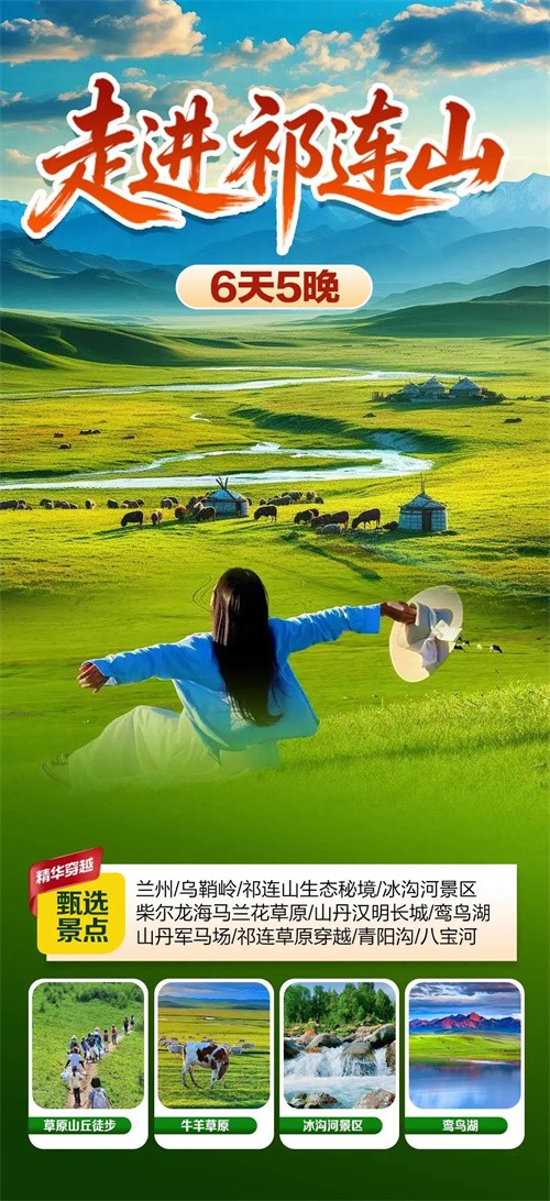 第五日:祁连山草原穿越/中国最美六大草原之一开启今天的旅程。祁连山脉连绵起伏,还有广袤的草原风光,是陶冶心灵的绝佳风景区。今天,我们将带领大家徒步穿越【祁连草原】。沿途河流蜿蜒流淌,映照着万千风景,阳光透过云层,天空湛蓝透明仿佛能摸到它的边缘。远处山峦高耸,像巨人守护一方平安。我们缓缓行走其间,你会找到内心的宁静和前所未有的安全感,人与自然的界限变得模糊。每一位淳朴的牧民,可爱的牛羊,盛开的野花,都能轻易驱散你所有的焦虑和不安,带来洗礼与重生。当徒步结束,回首祁连山,它伟岸的剪影熠熠生辉,会成为你内心无法忘却的风景。今晚我们宿在祁连县,累了一天,希望大家做个好梦。