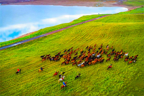 鸾鸟湖是山丹马场境内的一座水库,因与古代鸾鸟城遗址相邻,故称为鸾鸟湖。该湖是祁连冰川雪水融化后汇流形成的高原湖泊,湖水清澈湛蓝,与周边草场、成群的骏马、远处的雪山共同构成独特景观。初秋时节,湖面出现“水天一色”景象,日出时红霞倒映湖面,形成宁静致远的画面。