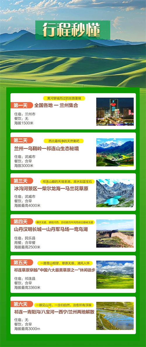 第二日:兰州-乌鞘岭-祁连山生态秘境。今天,我们将来到地处黄土、青藏、内蒙三大高原交汇地带的【乌鞘岭】。从张骞出使西域,到玄奘西天取经,这里曾来过壮志未酬的林则徐,也曾站过意气风发的霍去病。乌鞘岭的云烟和雪山交缠,在风的催使下蜿蜒西去,目之所及皆是雄美壮阔。顺着木栈道走上观景台,抬头是“祁连千峰起,雪山万重连”的巍峨,是三大高原交汇处的震撼。吹一吹先辈们曾吹过的风吧,把他们的信念和勇气延续下去。午后,我们将抵达一个被磨脐山温柔环抱的【藏地秘境】,这里的森林覆盖率高达60%以上,可以尽情呼吸来自海拔2500米以上的纯净空气。沿着步道缓缓上行,这里是一片原生态的秘境,可以远眺祁连山的壮丽景色,继续前进抵达高山草甸区域,夏季时节,这里绿草如茵,野花遍地,犹如天然的锦绣地毯。稍事休息,我们傍晚入住武威市。